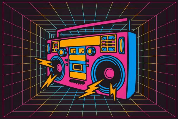 Med en neonfarvet ghettoblaster, der svæver i et digitalt gitter, bringer dette design 1980'ernes ukuelige ånd tilbage. De levende farver og geometriske linjer skaber en følelse af bevægelse og giver et retrodyk ind i ghettoblasterens storhedstid.
