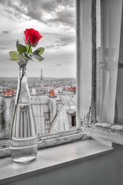 En rød rose ved vinduet med Eiffeltårnet i baggrunden. Billedet er i sort og hvid med røde farver som detalje.