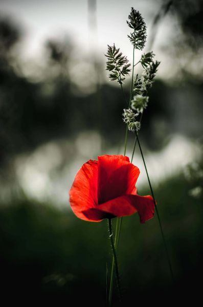 Rød valmue med et græsstrå i marken. En skarp nærbillede af en valmue med en ude af fokus tapet.