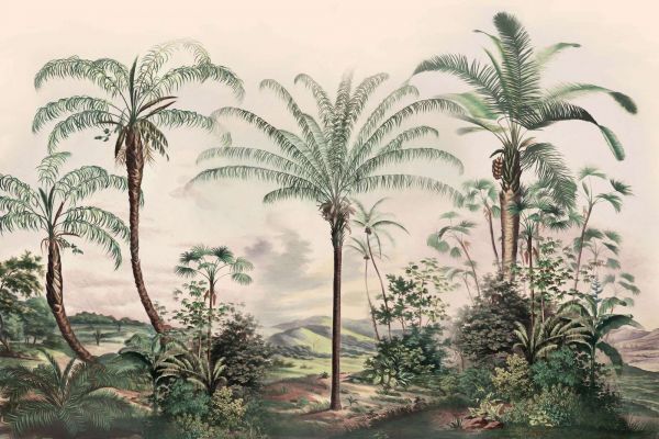 Et stemningsfuldt tropisk landskab med høje, elegante palmer og frodig vegetation. De bløde pastelfarver og subtile penselstræk giver det hele et vintage og kunstnerisk udtryk. I baggrunden skaber bølgende bakker og en lys, overskyet himmel en rolig og drømmende atmosfære.