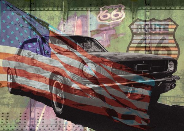 Et vintage-inspireret kunstværk, der kombinerer en klassisk bil med ikoniske amerikanske symboler som Route 66-skilt og USA's flag. Designet udstråler nostalgi og frihed.