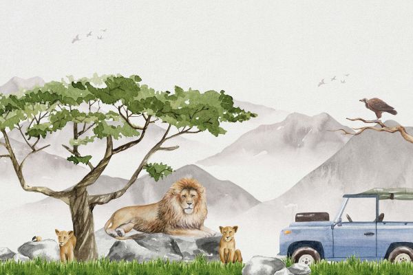 En akvarelillustration af en safari med løver og en Jeep-bil.