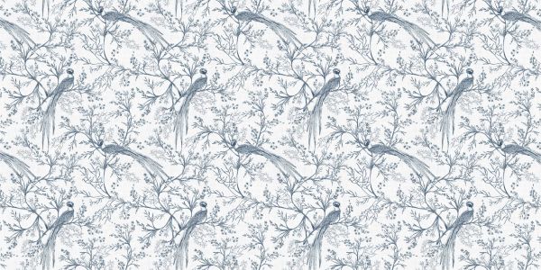 Dette design viser en delikat dans af svaler, der svæver gennem en æterisk have af fint forgrenede blomster. De monokrome blå toner på en baggrund af hør giver en rolig, men alligevel levende fornemmelse.