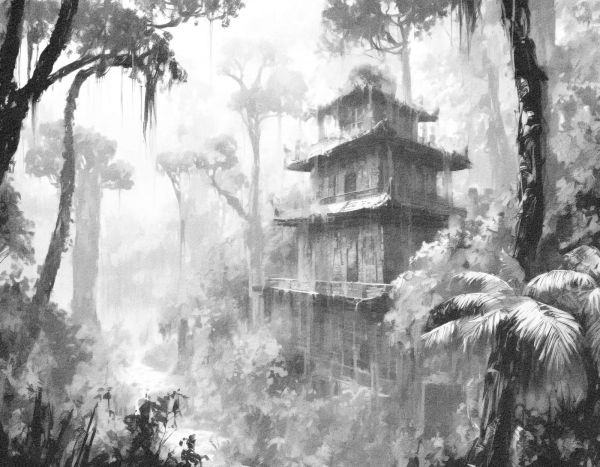Dette kunstneriske design afslører en skjult træhytte i en tæt, tåget skov. Omgivet af høje, mystiske træer og hængende mos, skaber denne tegning en følelse af afsondrethed og eventyr.