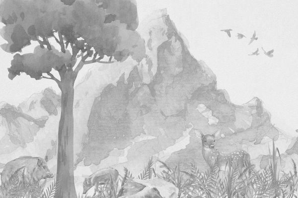 Et foto i bløde grå nuancer af et rådyr, et vildsvin og hendes unge. Bor i naturen og skoven med et bjerg og fugle i baggrunden.