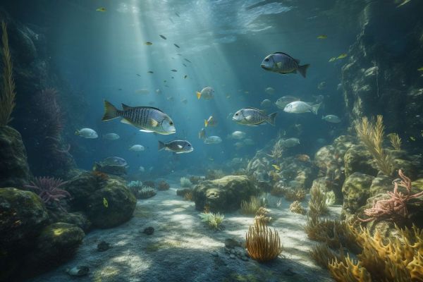 En fredfyldt undervandsverden udfolder sig, hvor sollyset forsigtigt falder gennem det klare vand og fremhæver de mangfoldige havbeboere. Den beroligende harmoni mellem blomstrende koraller og svømmende fisk skaber en naturlig symfoni af farver og liv.