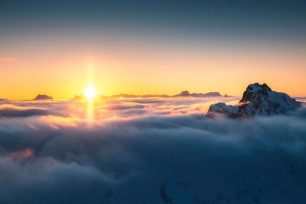 Dit fortryllende billede viser et sjældent og betagende naturfænomen: en solopgang højt over skyerne. Solen bryder lige igennem bag horisonten, og dens gyldne stråler oversvømmer skyhavet med varme nuancer. Under tågen stikker nogle sneklædte bjergtinder kraftigt ud, som stille vogtere over en sovende verden. Farverne flyder sømløst fra dybblå til gylden og blødrosa, hvilket giver det hele en drømmende, næsten himmelsk karakter.