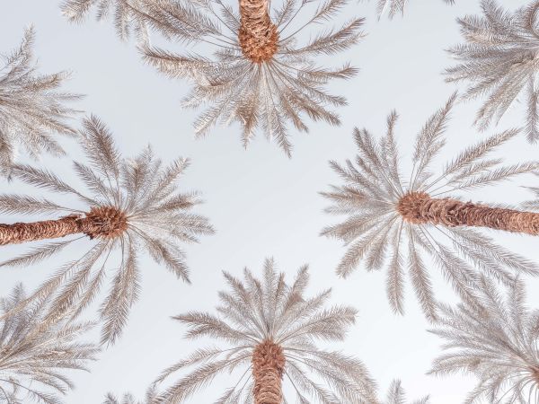 Tropiske palmetræer fotograferet nedefra. Kombiner dette fototapet i dit hjem for at skabe endnu mere stemning.