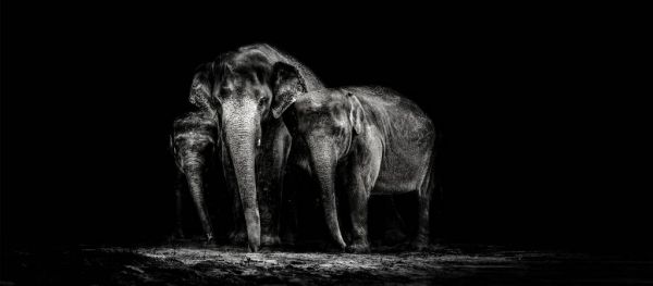Fototapet med et panoramafoto med et sort / hvidt foto af 3 elefanter