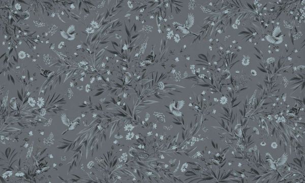 Dit stilfulde design fanger roen fra en blomstrende have i et subtilt farvepalet af blågrå, gråblå og bløde naturnuancer. Rødhalse og sangfugle flakser let mellem detaljerede blade, tusindfryd, græs og markblomster, afbrudt af små sommerfugle. Alt er gengivet i blide nuancer, hvilket holder det hele roligt og stemningsfuldt. Baggrunden i en dæmpet blågrå farve giver designet dybde uden at dominere og skaber en fin balance mellem lys og mørke. Mønstret føles som et klassisk botanisk maleri, men i en moderne, tidløs farvesammensætning. Særdeles velegnet til en moderne klassisk eller skandinavisk naturlig indretning, hvor blide farver og naturlige motiver sætter tonen. Kombiner dette design med lysegrå eller beige møbler, linned eller uldne tekstiler, træsorter som eg eller ahorn og dekoration i keramik eller glas for en harmonisk, afdæmpet stemning. Anvendelig i et soveværelse, stue, børneværelse, arbejdsværelse eller roligt venteværelse. Også smukt i boutiquehoteller, wellnessområder eller foyerer, hvor en blid, forfinet stemning ønskes. Et elegant, naturligt design med en rolig undertone. Kombinationen af flaksende fugle, florale detaljer og kølige toner gør dette mønster tidløst, roligt og særligt stemningsfuldt.