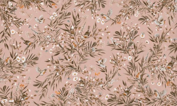 Dit design udstråler blødhed og poesi. På en subtil pudderrosa baggrund udfolder sig et elegant landskab, hvor rødhalsene bevæger sig mellem tusindfryd, blomster, slanke grene og sommerfugle. Bladene er udført i naturlige beige- og brune toner, der harmonerer smukt med den varme rosa. Denne farvevalg skaber en raffineret balance mellem romantik og naturlighed. Farverne er delikate og indbydende: rosa udstråler en følelse af blødhed og tryghed, mens de varme bladfarver og de livlige fugle giver designet dybde og karakter. Dette gør det ideelt til et romantisk klassisk interiør eller en vintage-inspireret stil. Tænk på elegante møbler med runde former, pastelfarvede accessories, messingdetaljer og linned eller fløjl. Den organiske sammensætning af blade og blomster skaber en flydende bevægelse over det hele, mens de legende rødhalse tilføjer en livlig accent. Det hele føles let og raffineret, uden at miste kompleksitet. Sommerfugle og små blomster styrker følelsen af forår og ømhed. Særdeles velegnet til rum, der kræver en blød, indbydende atmosfære - som et pigeværelse, børneværelse, soveværelse eller en hyggelig krog i en stue. I kombination med accessories i gammelrosa, fløde, sandfarve eller let træ opstår en drømmende helhed, der udstråler ro og charme. Også smukt at kombinere med romantiske blomsterprints eller antikke detaljer for et endnu mere raffineret udtryk.