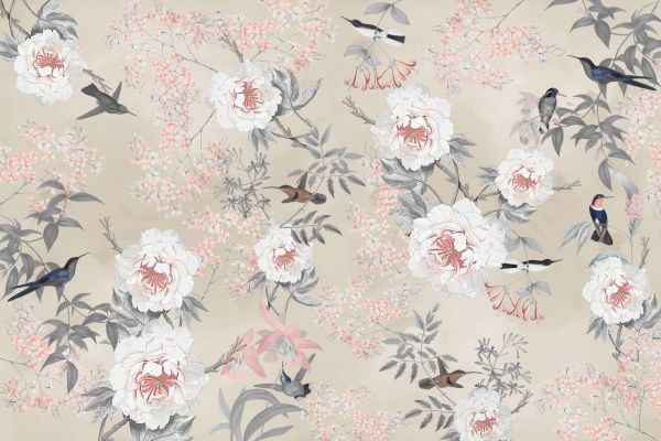 En raffineret sammensætning af naturlig skønhed, hvor blomster, fugle og botaniske elementer er afbildet i en harmonisk balance. Subtile farver og detaljerede mønstre giver et elegant og tidløst look, der forvandler ethvert rum.
