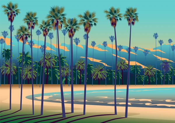 Illustreret åben sø med palmer og bjerge i baggrunden.
