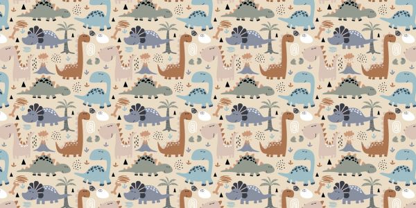 Et billede af tegnede dinosaurer med æg og knogler. Kombiner dette på børneværelset.