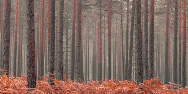 Træer på en bakke om efteråret. I forgrunden er der orangefarvede efterårsfarvede bregner.