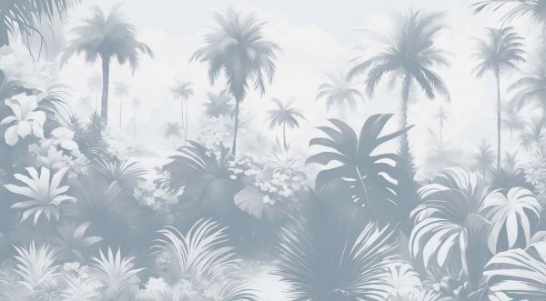 Et raffineret tropisk landskab i bløde blågrå nuancer, med elegante palmer og frodige eksotiske planter. Den subtile tåge og kølige pastelfarver skaber en fredfyldt og afslappende atmosfære, perfekt til en rolig og stilfuld ambiance i ethvert interiør.