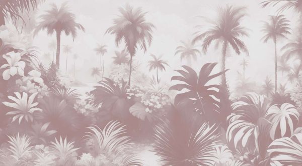 Et drømmende tropisk tableau i bløde puderosa nuancer, med elegante palmer og frodige eksotiske planter. Den tågede baggrund og subtile farvenuancer skaber en fredfyldt, næsten romantisk atmosfære. Perfekt til et beroligende og raffineret udtryk i ethvert interiør.