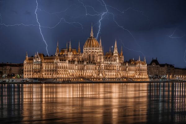 Under stormen på fototapet. Et smukt oplyst slot under et tordenvejr med lyn på himlen.