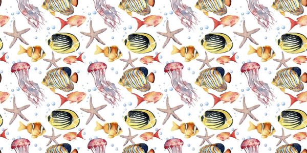 En fest af marineliv i akvarel, dette billede sprudler af farve og bevægelse. Fra majestætiske gopler til elegante søstjerner, hvert element er omhyggeligt malet for at danne et levende tæppe af oceanet.