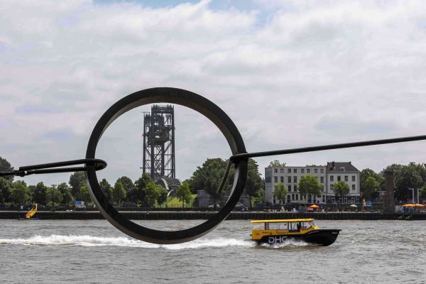 Et legende og dynamisk bybillede, hvor den ikoniske Hefbro perfekt indrammes af et cirkelformet metalelement. I forgrunden sejler en iøjnefaldende gul vandbus over Maas, hvilket tilføjer bevægelse og energi til kompositionen. Den klare himmel og det grønne på den anden side giver et friskt og afbalanceret udtryk.