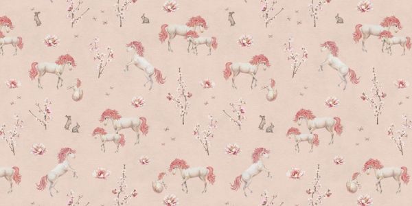 Et fortryllende mønster med elegante enhjørninger, blomstrende grene og bløde blomster. De romantiske rosa nuancer og delikate illustrationer skaber en magisk, drømmende atmosfære, perfekt til at tilføje et fantasifuldt accent til ethvert rum.