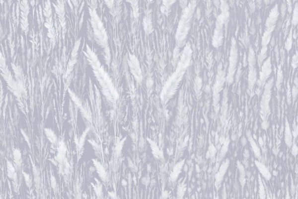 Pluimgræsser i bløde blå nuancer bølger fredeligt på en raffineret, let tonet baggrund. Den delikate overgang fra lysere til mørkere nuancer skaber en drømmende, næsten akvarel-lignende atmosfære, perfekt til et roligt og moderne interiør.