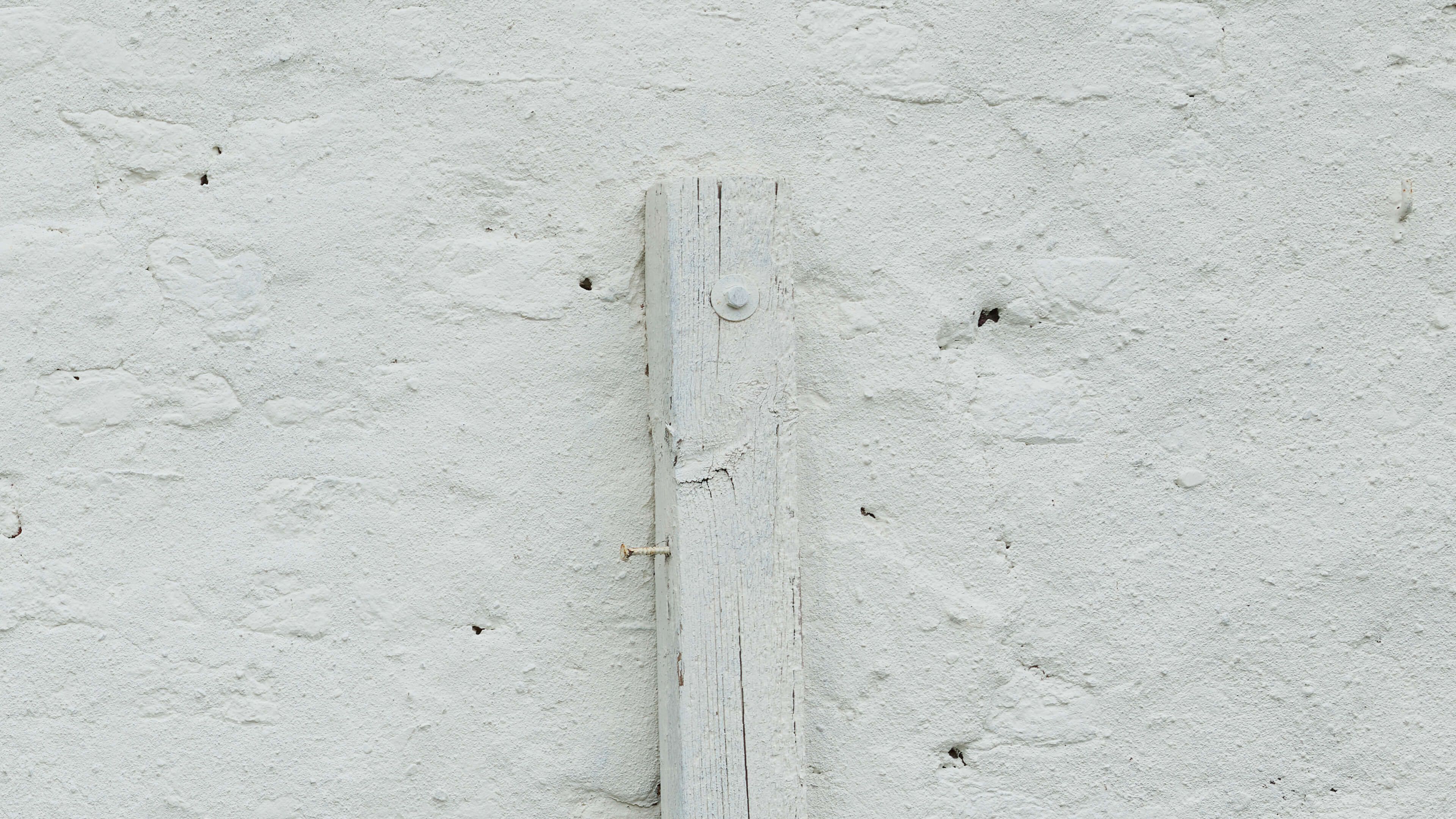 Væg med hvidt puds og en træbjælke. Detaljerne på denne væg er nemme at se.
