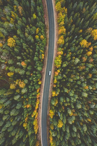 Set ovenfra af en smal vej gennem et landskab med fyrretræer.