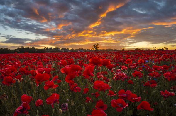 Et smukt billede af en rød valmueplads med en detaljeret orangeblå himmel i baggrunden.