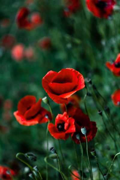 Et detaljeret billede af røde valmuer på en baggrund af grønt græs.