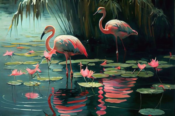 I denne fredfyldte oase vader flamingoerne elegant mellem blomstrende vandliljer. De subtile refleksioner i det rolige vand og de spredte rosa blomsterblade tilføjer en delikat skønhed til dette serene syn.