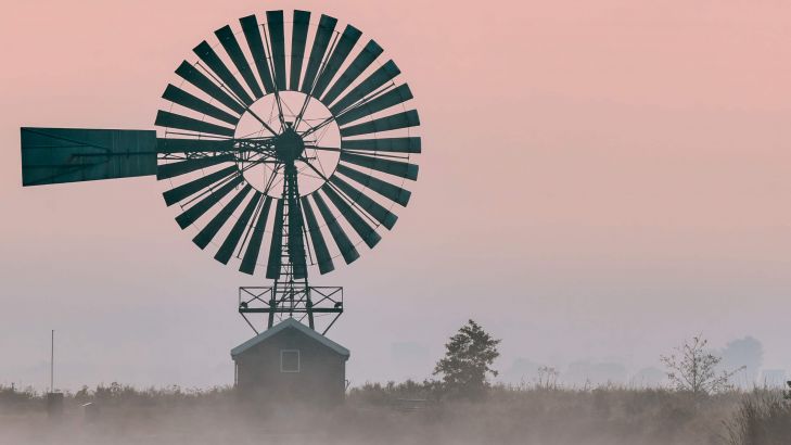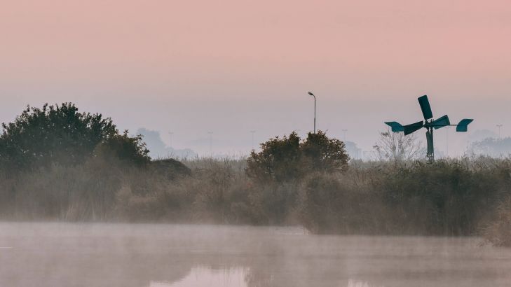 Metalvindmølle ved solopgang med tåge. Du kan se metalvindmøllens spejlbillede i søen.