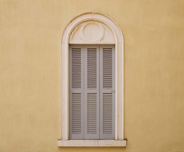 Vindue med grå træskodder på en gul væg. Hæng den op i din stue.