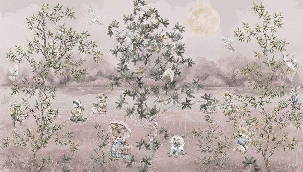 Denne yndige illustration viser et eventyrligt skovlandskab i en blød rosa glød, hvor en gruppe charmerende skovdyr samles til en glad eftermiddag fyldt med leg, musik og afslapning. Dyrene er klædt i nostalgiske tøj og giver hver især deres eget karakter til scenen: en grævling spiller mandolin, en frø hopper med et sommerfuglenet, en kanin går med en trillebør fyldt med blomster, og en pindsvin nyder at gynge. Mellem træerne læser andre dyr bøger, holder en picnic eller hviler fredeligt. Farvetonerne i dette design er varme og drømmende, med en blød base af rosa, lavendel, grågrøn og creme. Disse harmoniske nuancer bringer en beroligende og romantisk følelse med sig. De passer perfekt ind i et vintage børneværelse eller et klassisk babyværelse med lyse træmøbler, rattan accenter og stoffer i linned, bomuld eller blød velour. Billedet bringer ikke kun stemning, men også en følelse af nostalgi og ro. Omgivelserne med elegante træer, svævende sommerfugle, en fuldmåne og en rislende bæk indbyder til fantasifulde historier og leg. Gennem de rige detaljer bliver børn (og voksne) ved med at opdage nye elementer. Ideelt til rum, hvor fantasi og blødhed kan mødes – tænk på et babyværelse, børneværelse, legehjørne eller læseområde. Kombiner det med blød belysning, bogreoler i børnehøjde og hyggelige tekstiler i matchende nuancer for et komplet og stemningsfuldt helhed.