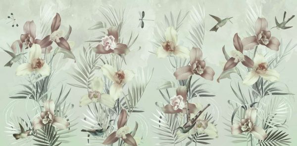 Elegant design med frodige blomster, kolibrier og yndefulde blade, beriget med bløde farvesammensætninger. Disse mønstre bringer en raffineret og beroligende naturlig skønhed til ethvert rum.