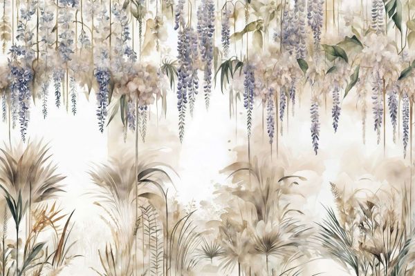 Et seren og raffineret design, hvor hængende blåregn og frodige hortensiaer mødes med yndefuldt svajende græs. Den bløde akvarelteknik og de neutrale nuancer af beige, guld og lavendel skaber et beroligende, naturligt udseende. De subtile farveovergange giver dette design en elegant og drømmende atmosfære.