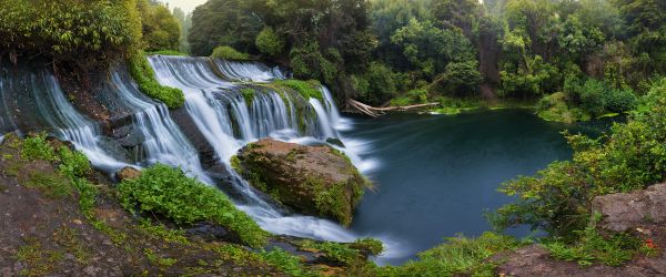 Vattenfall gömt i den tropiska djungeln och omgivet av en naturlig pool med klart vatten.