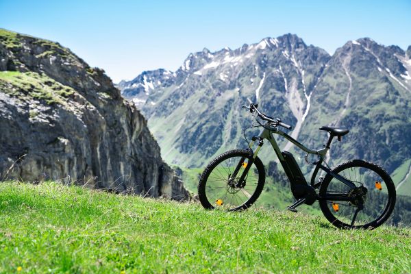 Fototapet av en elcykel i bergen i Österrike. Applicera detta på väggen i ditt sovrum.