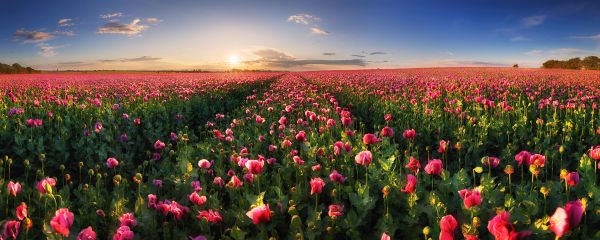 Ett panoramafoto av ett landskap fullt av vackra lila vallmor med solen i fjärran.