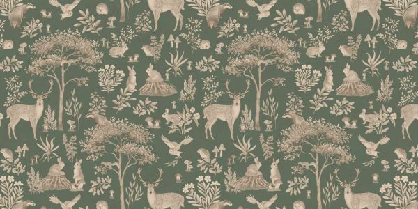 Ett magiskt skogsmönster med detaljerade djur som hjortar, kaniner, grävlingar och ugglor, inramat av träd, buskar och svampar. Den vintage bakgrundsfärgen skapar en sagolik, lugn atmosfär, idealisk för att lägga till en förtrollande accent i varje rum.