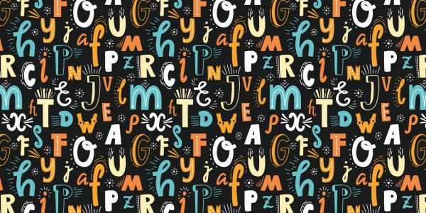 Färgat alfabet i olika stilar på en mörk bakgrund.