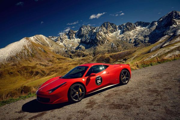 En fantastisk röd Ferrari 458 Italia står parkerad mot ett hisnande bergslandskap med snötäckta toppar och gröna sluttningar. Den djupa blå himlen och den karga omgivningen kontrasterar vackert med elegansen och hastigheten hos denna ikoniska italienska sportbil.