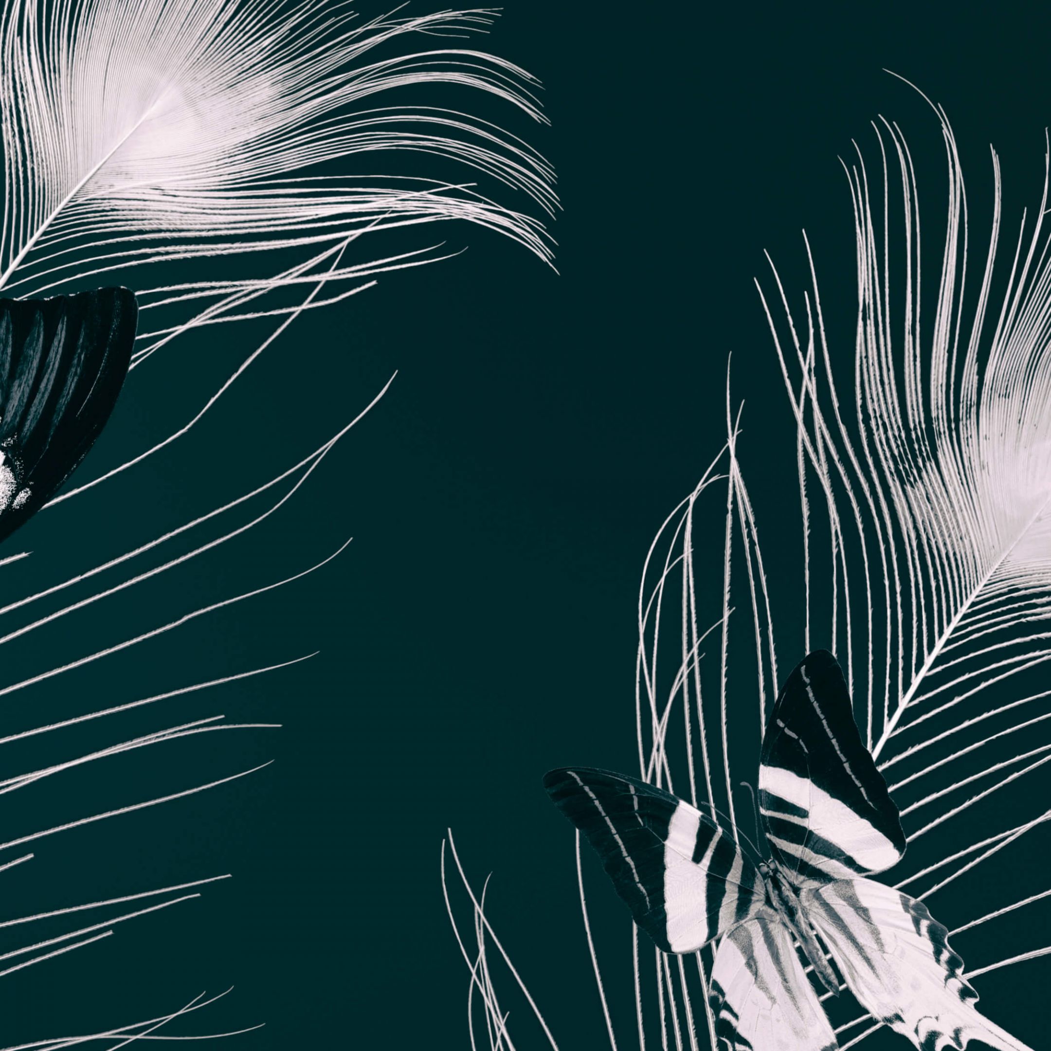 En konstnärlig kombination av vita påfågelfjädrar och fjäril framför en blå bakgrund.