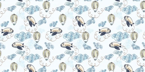 Undertecknad modell av flygplan och ballpåger på en ljusblå bakgrund.