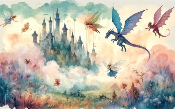 Ett magiskt fantasiscenario med ett stort slott omgivet av moln, feer och flygande drakar. Färgpaletten kombinerar mjuka pastellfärger som blått, rosa och gult, vilket ger designen ett drömlikt och sagolikt utseende.