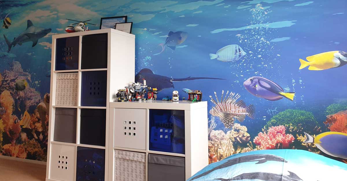 Fototapeter av havsdjur kan lätt stylas med resten av dina möbler. Ta en färg från tapeten som utgångspunkt och låt den dyka upp igen i dekoration. Går du för fototapet av en sjöstjärna på vit sand? Ta sedan sjöstjärnans apelsin till exempel och köp kuddarna till soffan i samma färg. En glad lampskärm. Och till exempel stolarna till matbordet. På så sätt kan du göra allt till en enhet. Om du väljer ett upptaget tryck, hjälper det också att hålla resten av interiören lugn. Då sticker havsdjurstapeter verkligen ut.