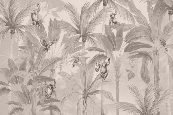 Upptäck en elegant symfoni av grå nyanser, sammanflätade med silhuetter av tropiska palmer. Denna design fångar essensen av en lugn oas där lekfulla apor trollar mellan bladen, en scen som andas både lugn och livlighet.