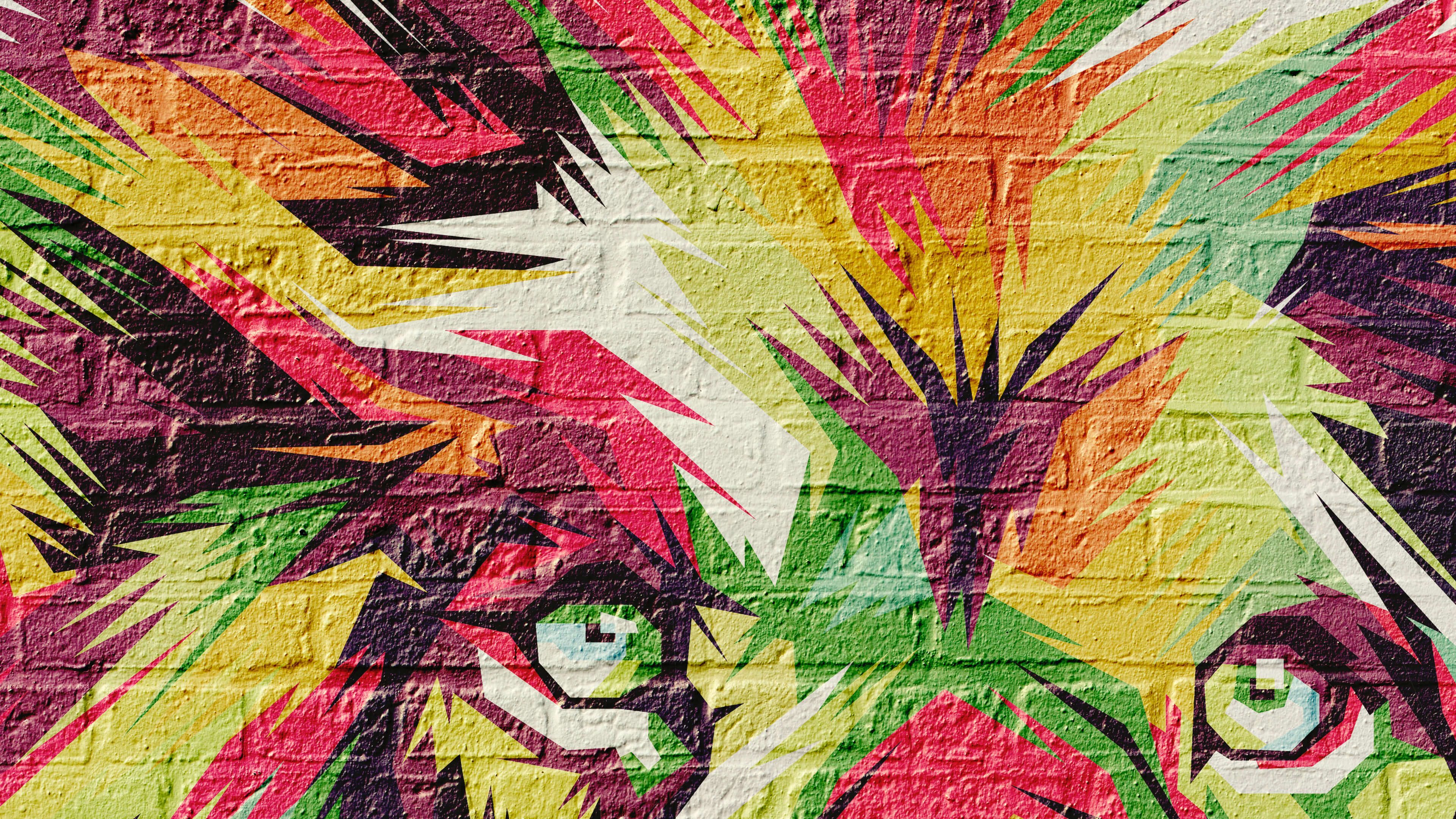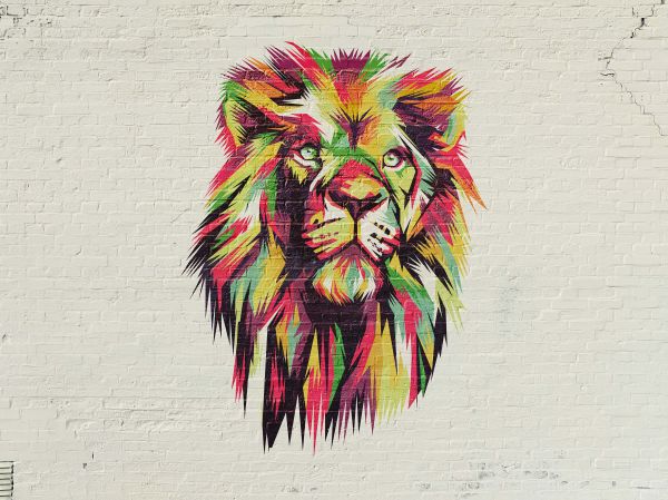Graffiti av ett lejon på en vit tegelvägg. Den ljusa bakgrunden gör att graffitilejonet framträder ännu tydligare.