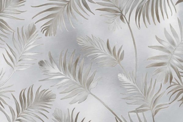 En strålande avbildning av palmblad i platinton på en mörk bakgrund, som tillför en subtil glans och förfining. Den kalla metalliska nyansen och den djupa basfärgen utgör en samtida och lyxig kombination.