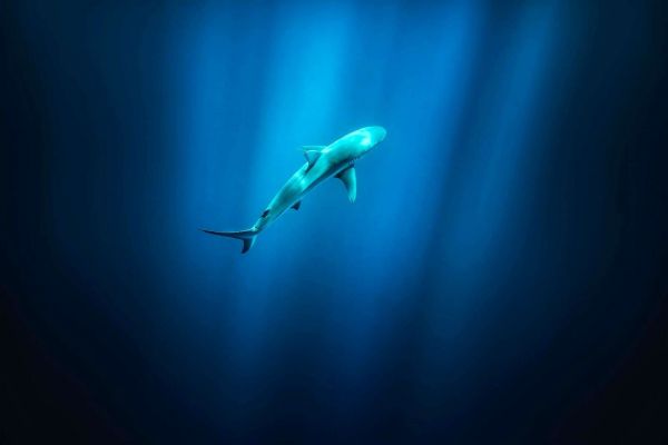 En ensam haj svävar elegant genom en djup ocean, badad i mjukt blåa ljusstrålar som tränger igenom vattnet ovanifrån. Bilden är kraftfull i sin enkelhet och framkallar en mystisk, tyst undervattensatmosfär.